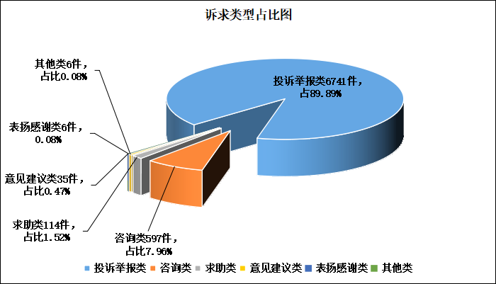 7月,区热线平台受理工单7499件,办结6749件,办结率90.00%。其中,投诉类6741件,占比89.89%;咨询类597件,占比7.96%;求助类114件,占比1.52%;意见建议类35件,占比0.47%;表扬感谢类6件,占比0.08%;其他类6件,占比0.08%。
