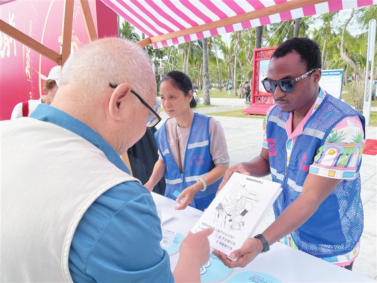 便民服务站点彰显城市温度。“健康守护·惠民义诊”站点前,医护人员为居民提供免费咨询与基础检查,传递“文明生活,健康先行”的理念;“法治同行·平安共建”站点通过仿真道具与趣味问答,普及禁毒禁赌知识,引导群众增强法治观念,共建平安吉阳。
