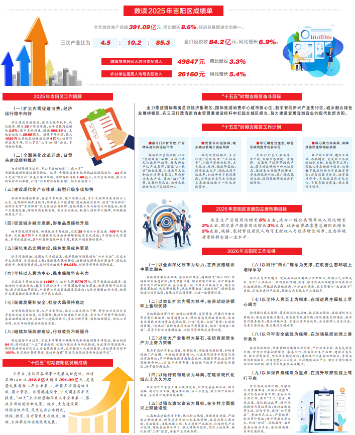 2025年,吉阳区坚持以习近平新时代中国特色社会主义思想为指导,全面贯彻习近平总书记关于海南工作的系列重要讲话和指示批示精神,在市委、市政府以及区委的坚强领导下,以务实之策应对复杂形势,以狠抓落实推动工作落地,努力化压力为动力、变潜能为动能、积优势为胜势,取得了来之不易的发展成绩。