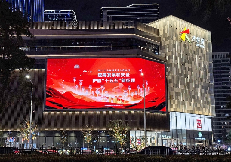 4月15日晚,“统筹发展和安全,护航‘十五五’新征程”主题标语在三亚大悦城户外大屏滚动播放。