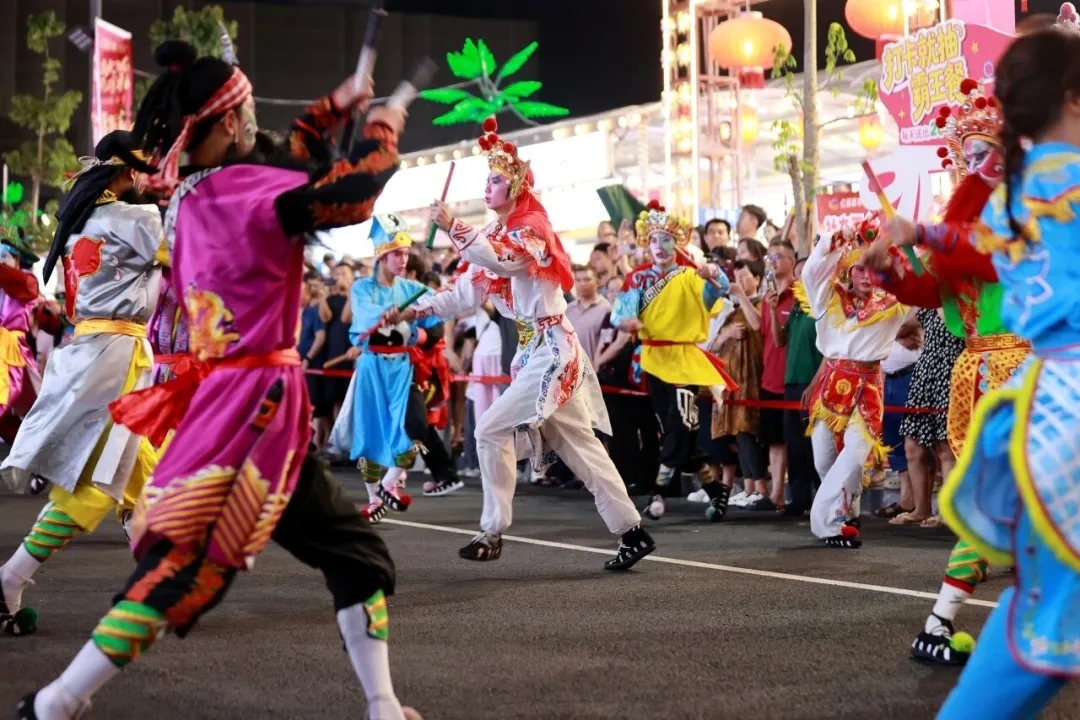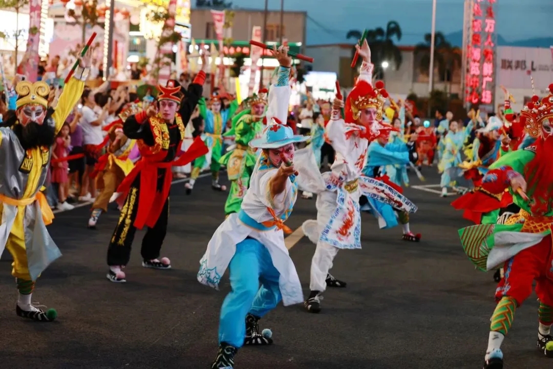 最令人心潮澎湃的,莫过于这场跨越山海的非遗邂逅。4月25日至27日,气势磅礴的潮汕英歌舞团队跳进亿恒夜市。铿锵的锣鼓声响彻夜空,画着脸谱的舞者舞步刚劲、气势雄浑,将岭南非遗的豪迈演绎得淋漓尽致。当这种古老而热血的民俗艺术,碰撞上三亚热带的海风与亚沙会现代竞技的活力,一场古今交融、南北邂逅的视觉盛宴就此精彩上演。